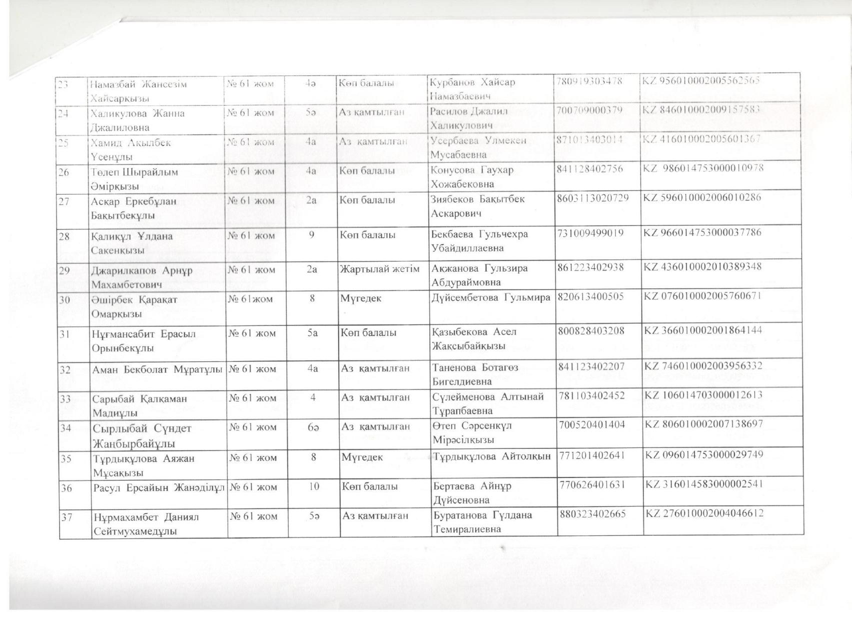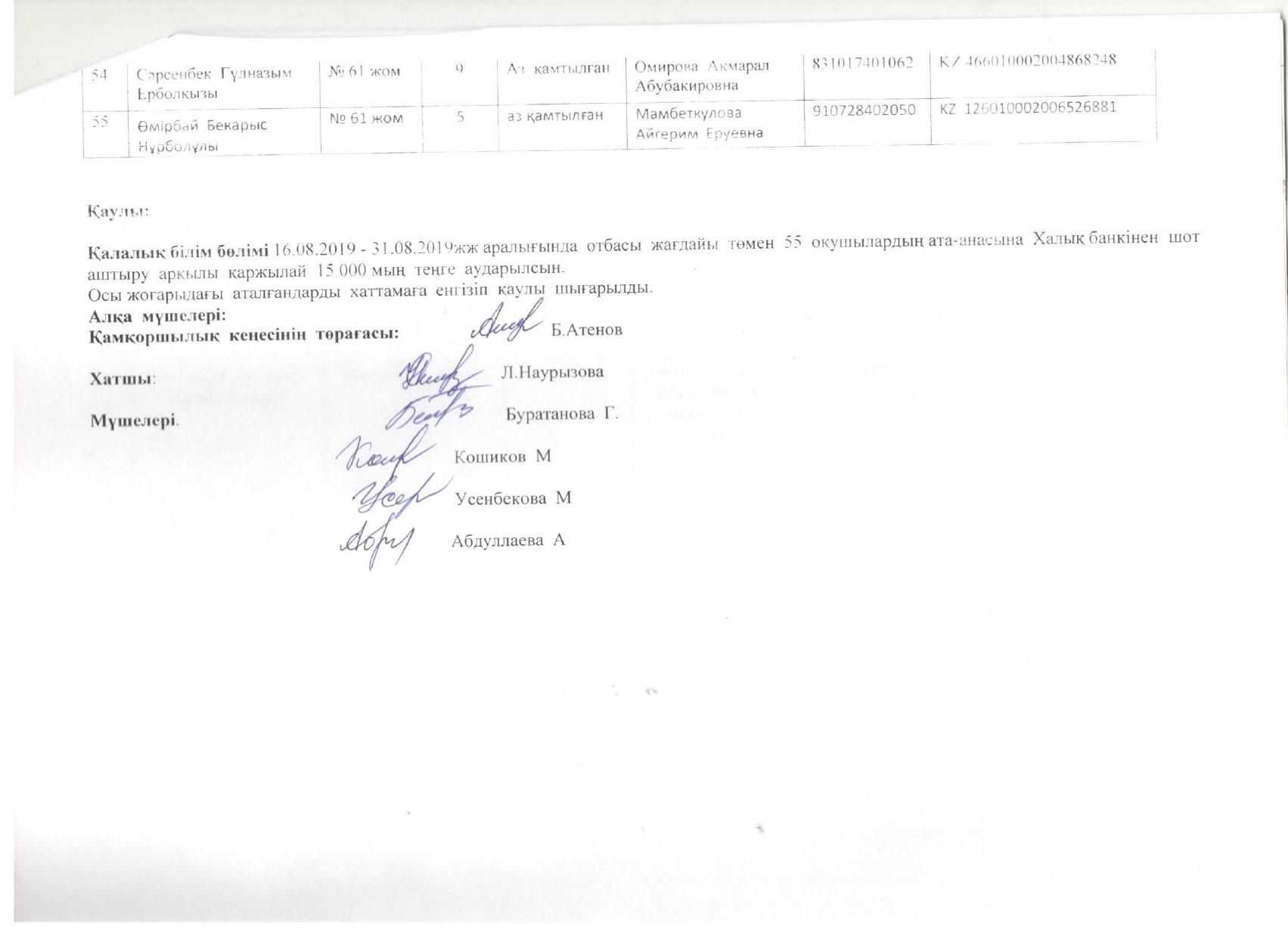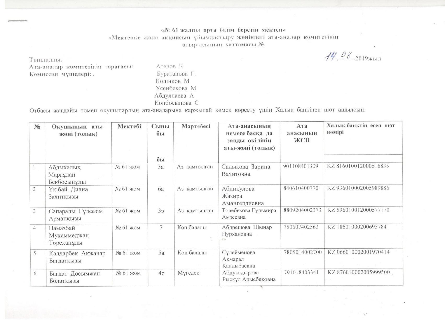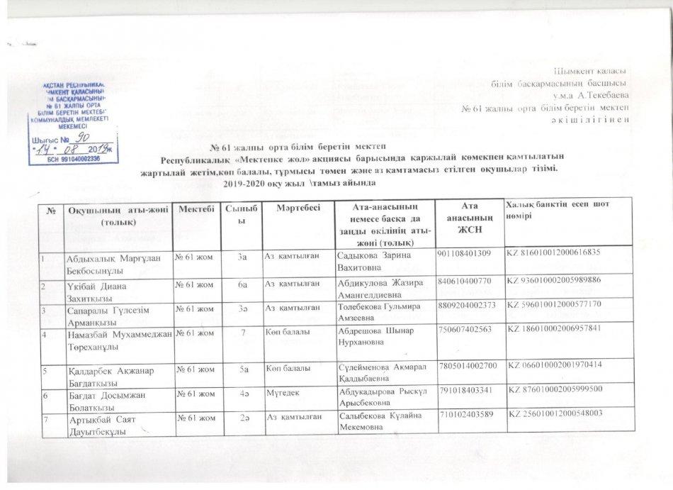 Мектепке жол Қаржылай көмек 2019-2020 оқу жылы » «N61 жалпы орта білім беретін мектеп» КММ