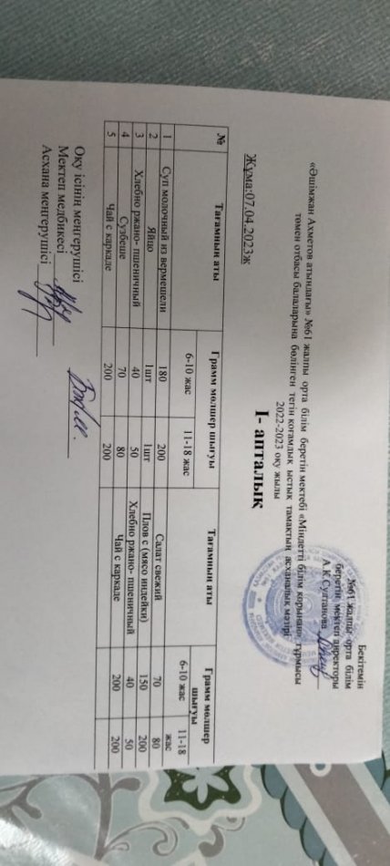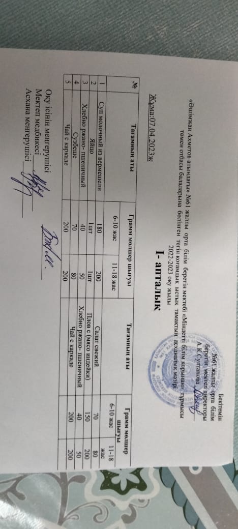 Оқушылардың ас мәзірінен фото есеп » «N61 жалпы орта білім беретін мектеп» КММ
