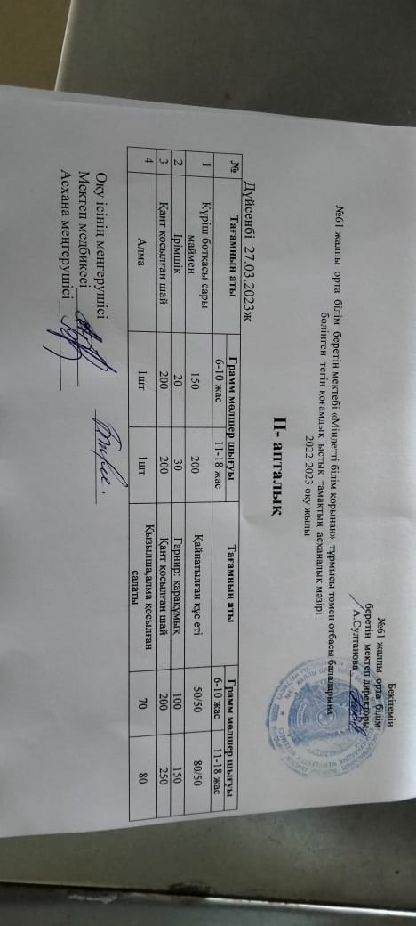 Апталық ас мәзірі. » «N61 жалпы орта білім беретін мектеп» КММ