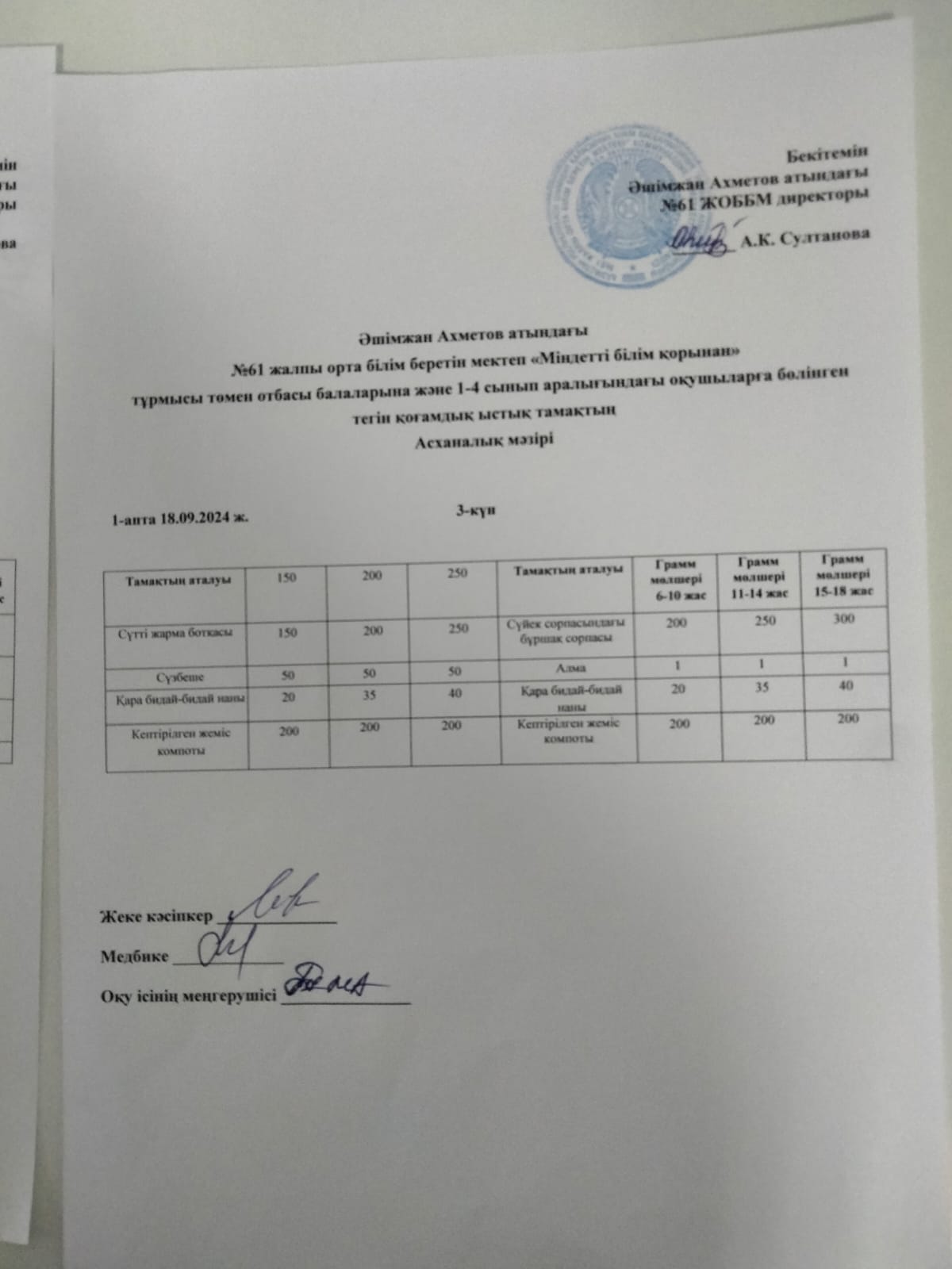 Оқушылардың ас мәзірінен үзінді » «N61 жалпы орта білім беретін мектеп» КММ