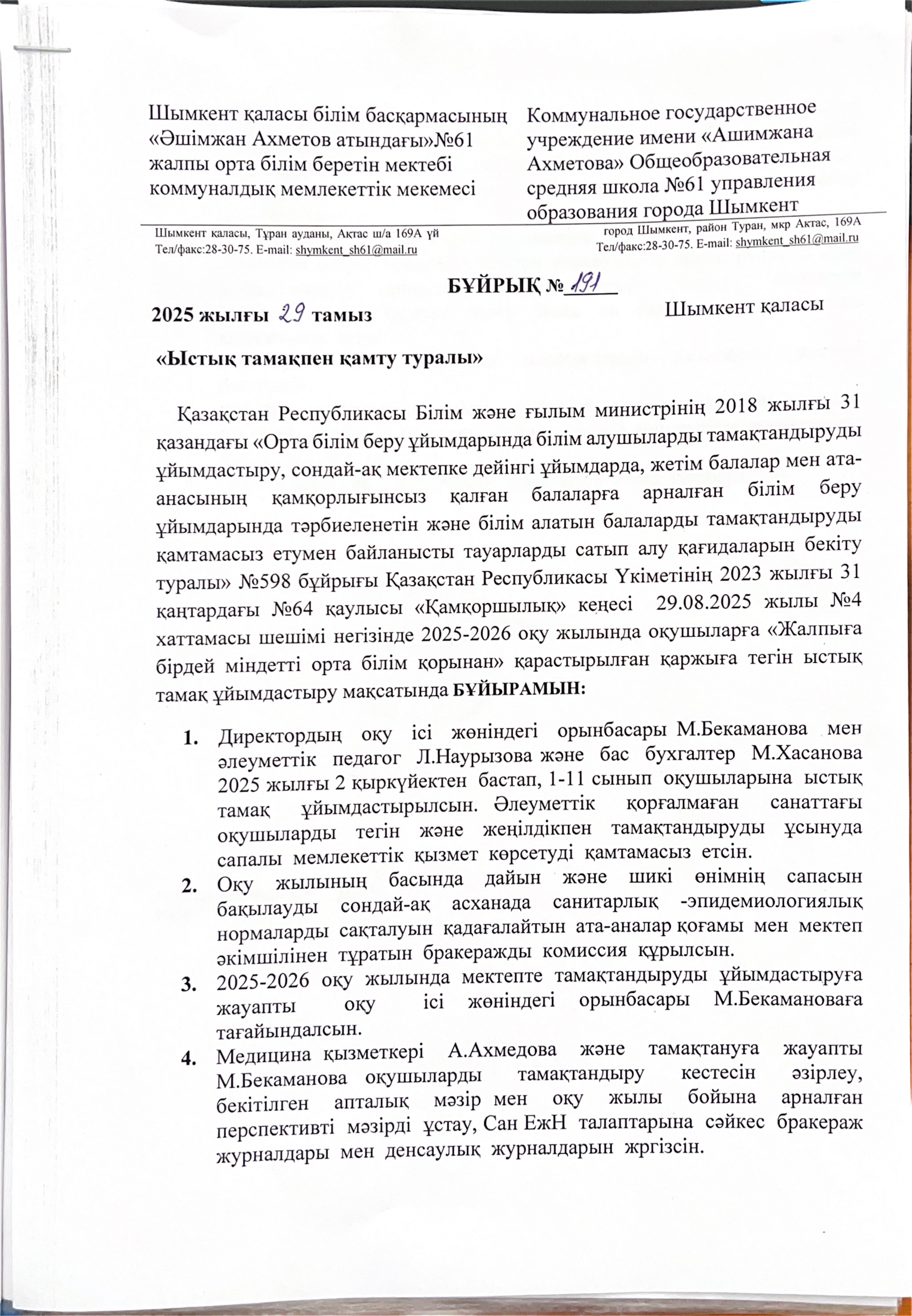 Ыстық тамақпен қамтылу » «N61 жалпы орта білім беретін мектеп» КММ