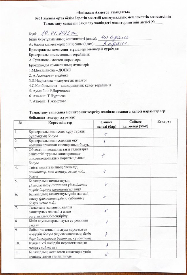 Асхананы тексеру бракераждық комиссиясының хаттамасы » «N61 жалпы орта білім беретін мектеп» КММ