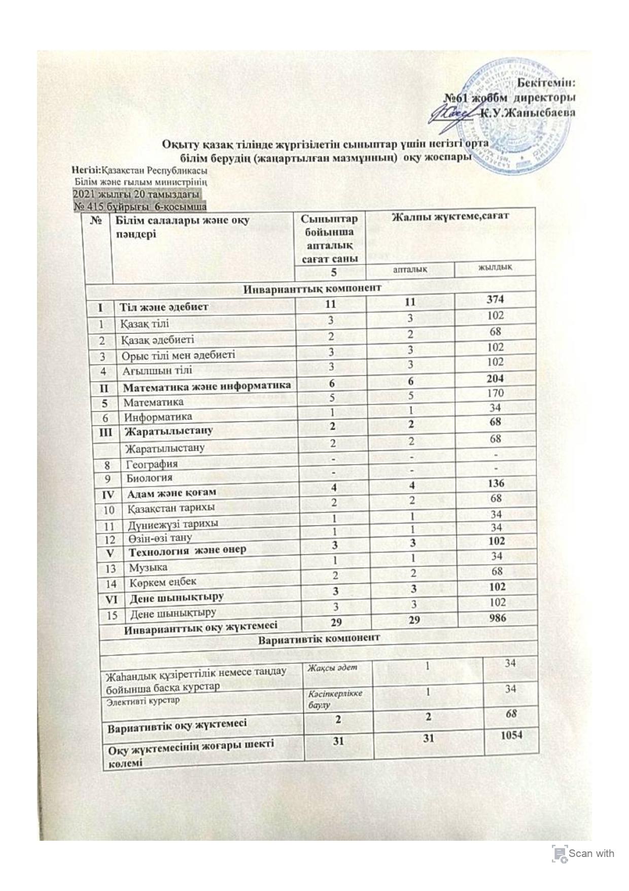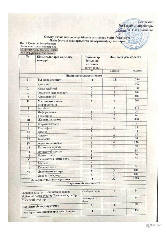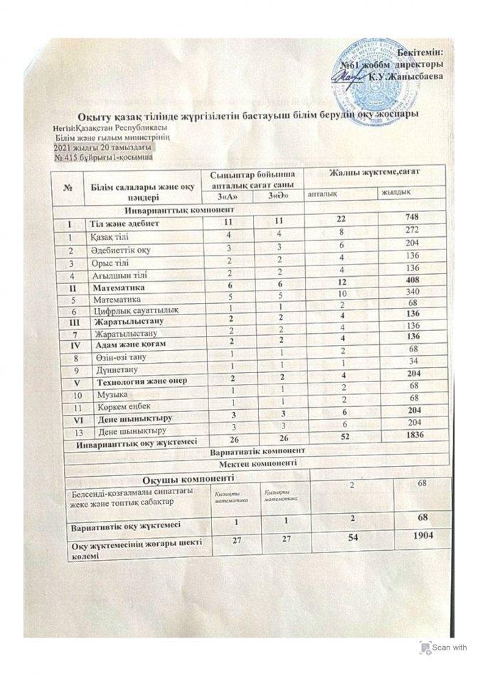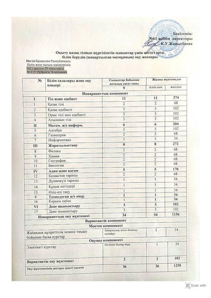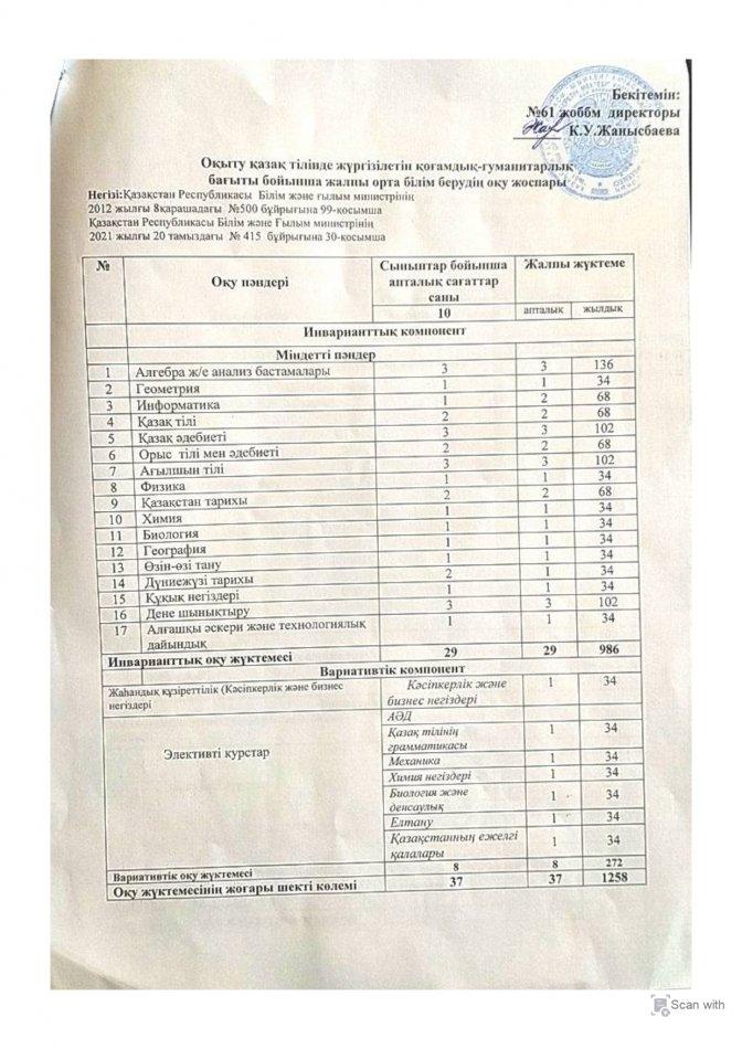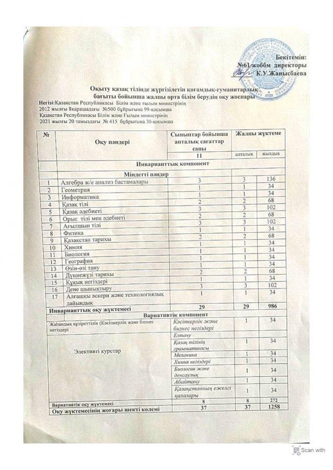 оқу жоспар 2021-2022 » «N61 жалпы орта білім беретін мектеп» КММ