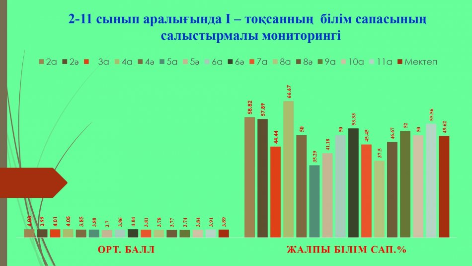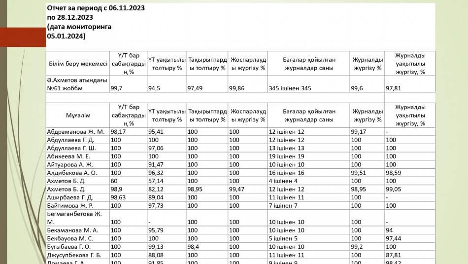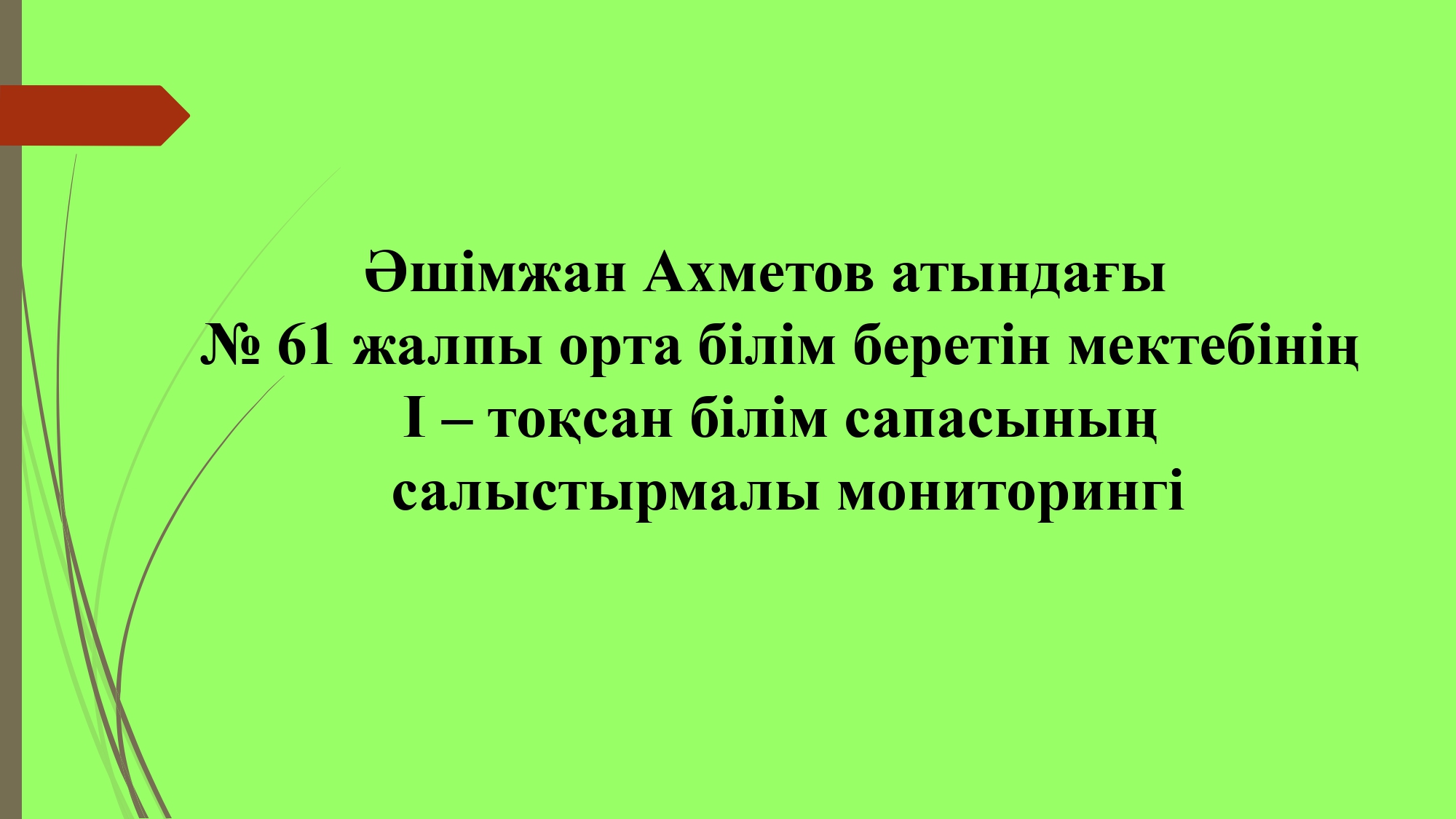 04 маусым 2024 0 1 2 3 4 5 Әшімжан Ахметов атындағы № 61 жалпы орта білім беретін мектебінің І – тоқсан білім сапасының салыстырмалы мониторингі [attachment=380][attachment=380:monitorings-61-zhobbm-1-tosan.pdf]