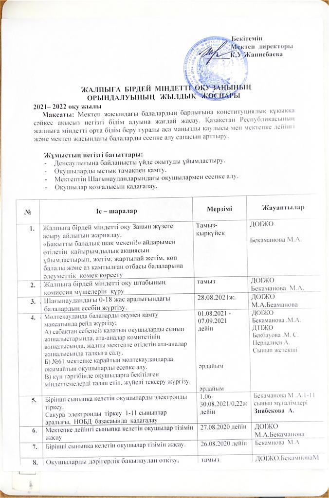 Жалпыға бірдей иіндетті оқу заңының орындалуының жылдық жоспары » «N61 жалпы орта білім беретін мектеп» КММ