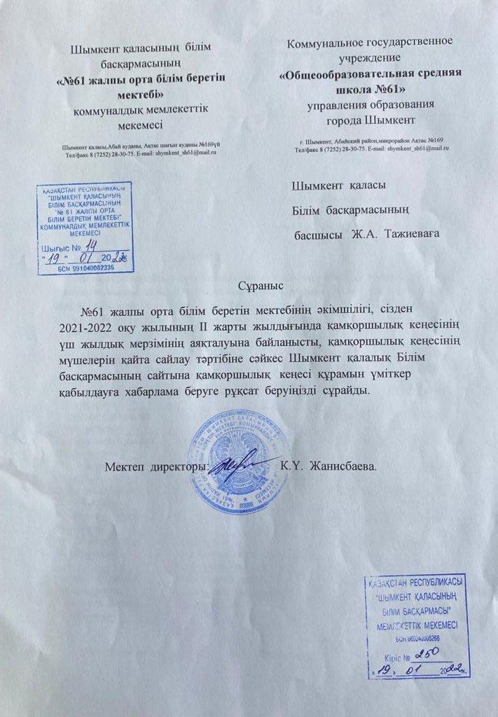 Қамқоршылық кеңес » «N61 жалпы орта білім беретін мектеп» КММ