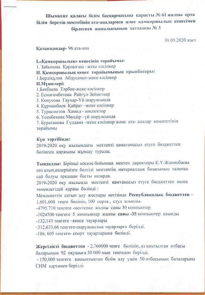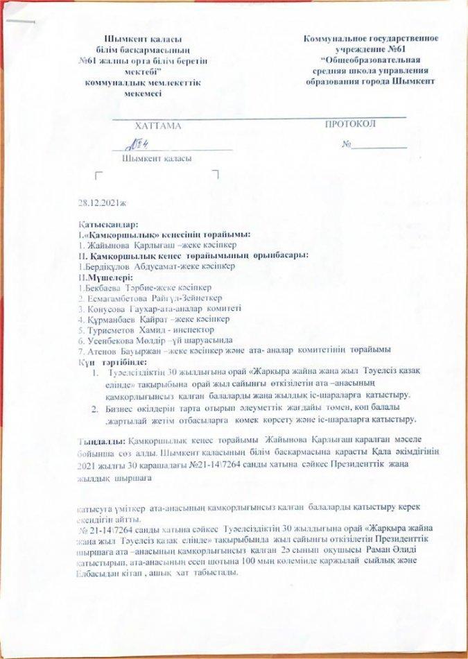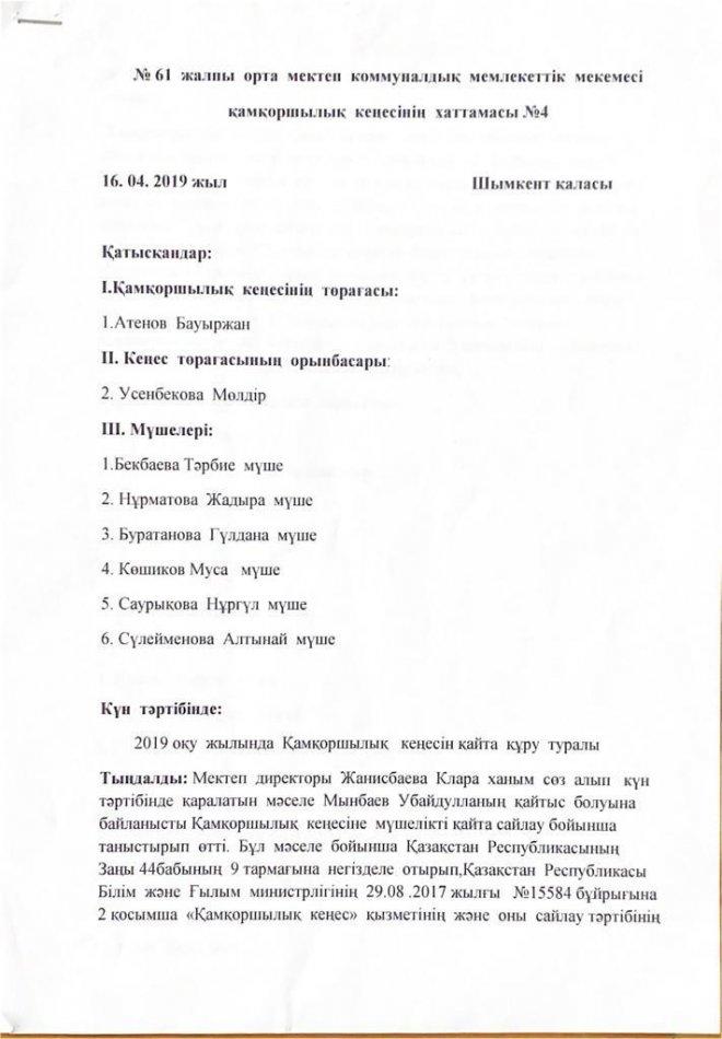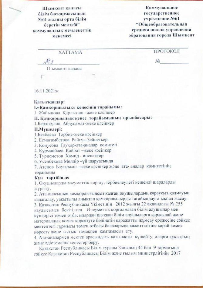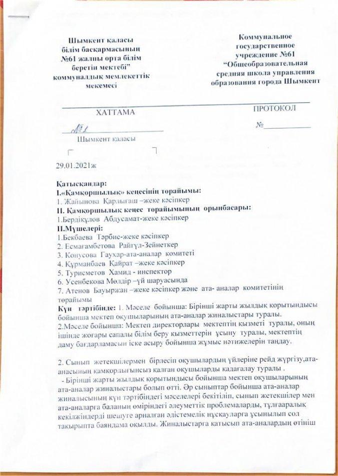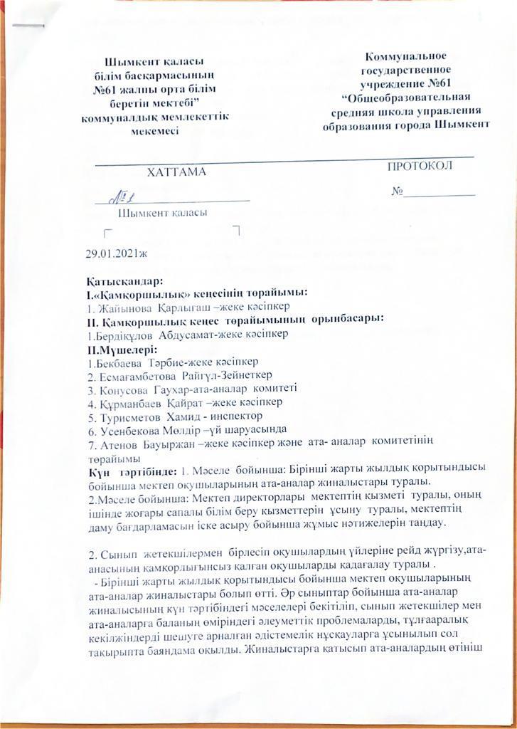 Қамқоршылық кеңесінің хаттамалары » «N61 жалпы орта білім беретін мектеп» КММ