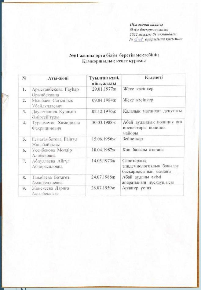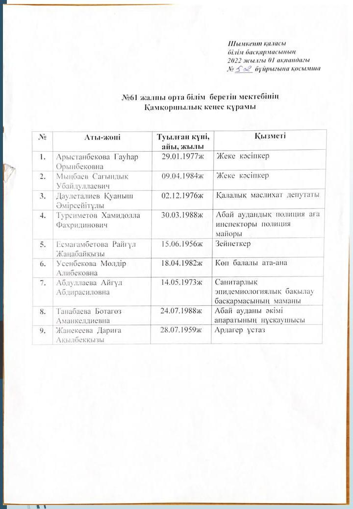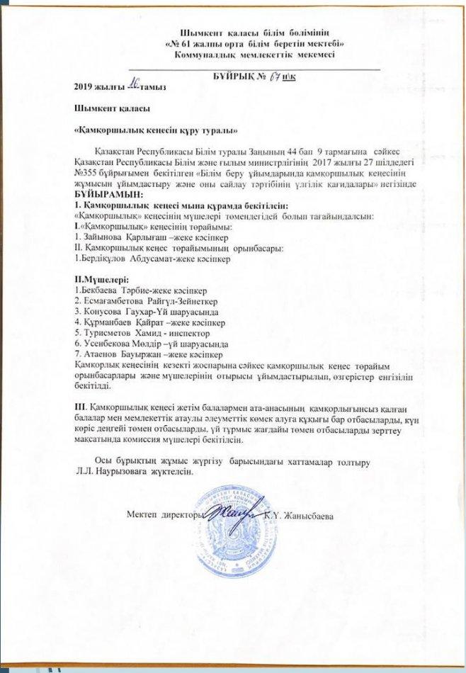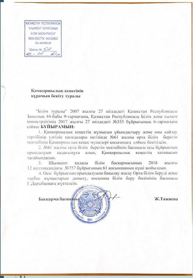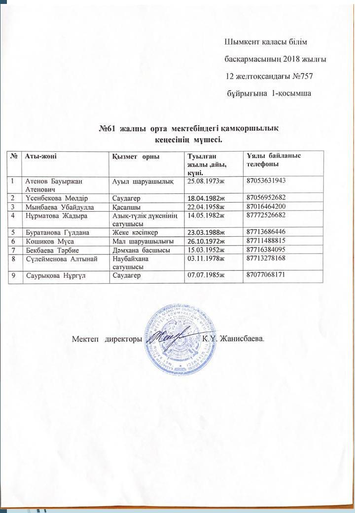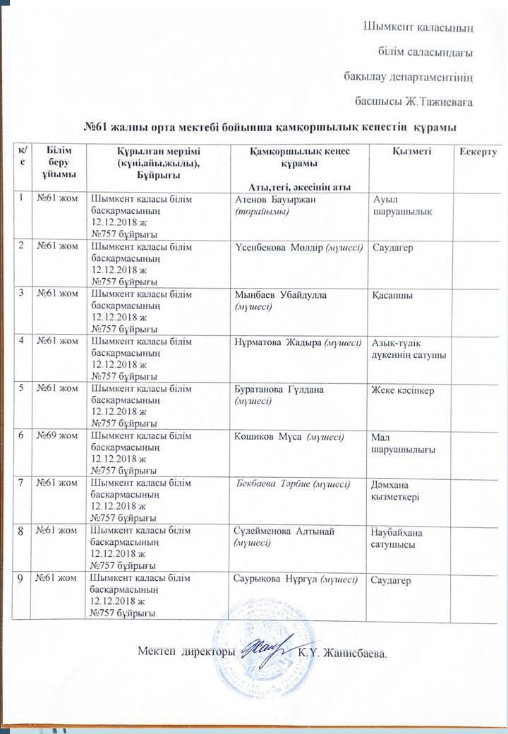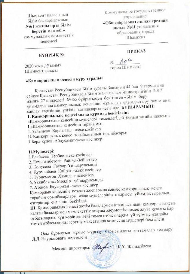 Қамқоршылық кеңесінің бұйрығы, тізімі. » «N61 жалпы орта білім беретін мектеп» КММ