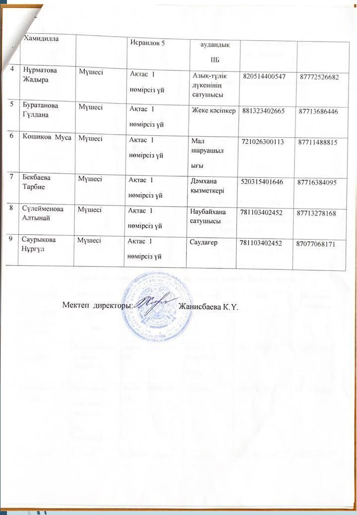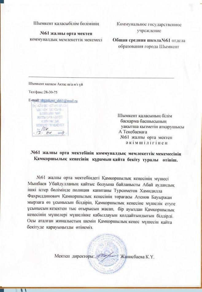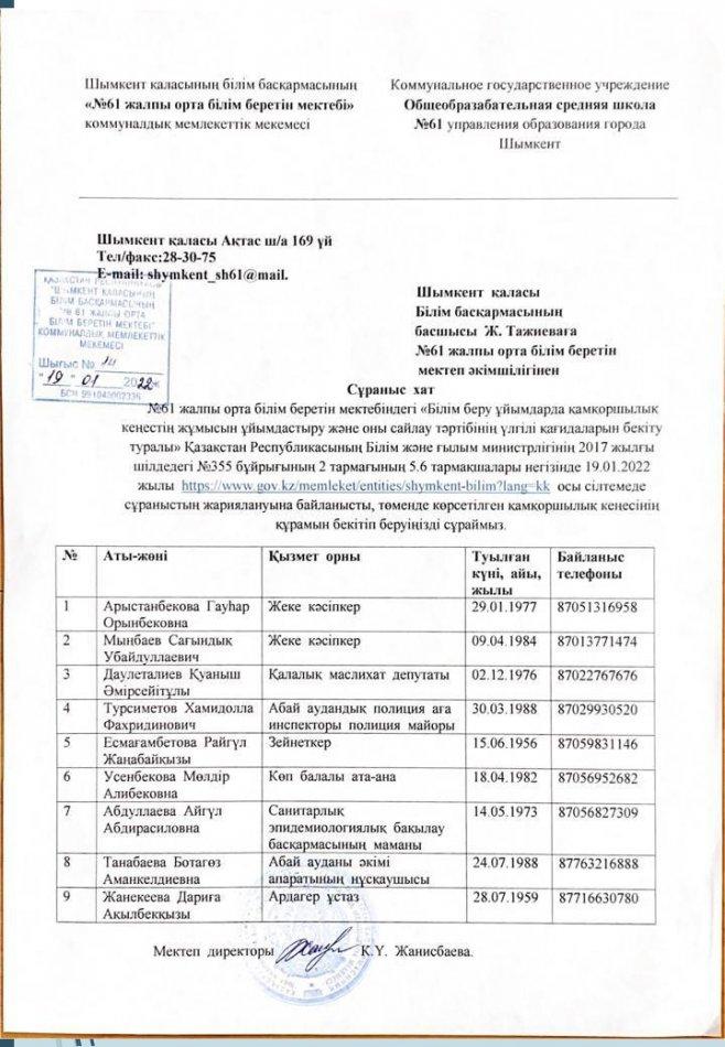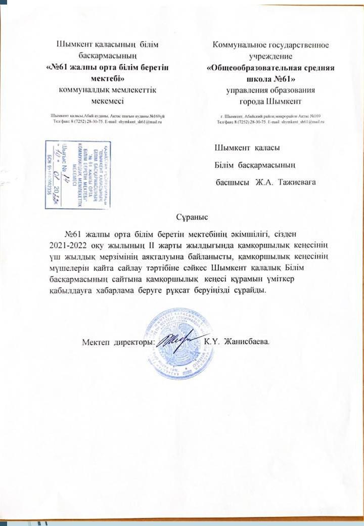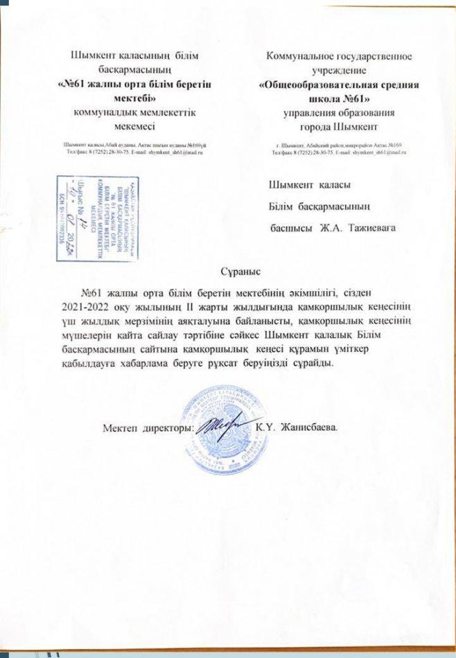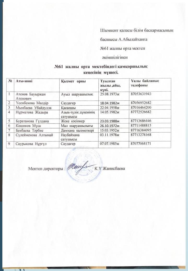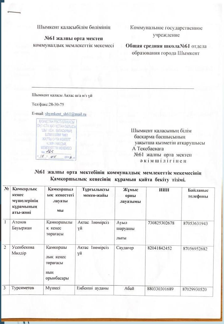 Қамқоршылық кеңесінің бұйрығы, тізімі. » «N61 жалпы орта білім беретін мектеп» КММ